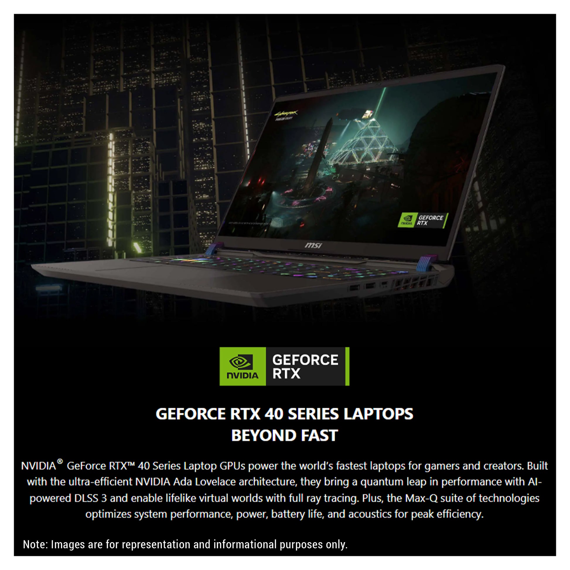 NVIDIA® GeForce RTX™ 40 Series Laptop GPUs power the world’s fastest laptops for gamers and creators. Built with the ultra-efficient NVIDIA Ada Lovelace architecture, they bring a quantum leap in performance with AI-powered DLSS 3 and enable lifelike virtual worlds with full ray tracing. Plus, the Max-Q suite of technologies optimizes system performance, power, battery life, and acoustics for peak efficiency.