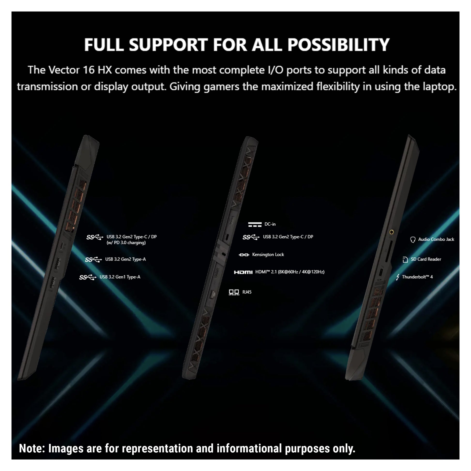 The Vector 16 HX comes with the most complete I/O ports to support all kinds of data transmission or display output. Giving gamers the maximized flexibility in using the laptop.