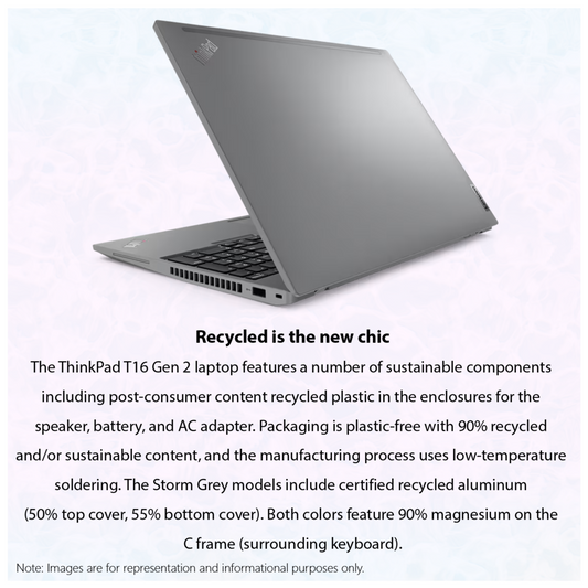 Lenovo ThinkPad T16 Gen 2 Great for youThe ThinkPad T16 Gen 2 laptop features a number of sustainable components including post-consumer content recycled plastic in the enclosures for the speaker, battery, and AC adapter. Packaging is plastic-free with 90% recycled and/or sustainable content, and the manufacturing process uses low-temperature soldering. The Storm Grey models include certified recycled aluminum. Corporate powerhousePowered by Intel vPro with Intel...Regular price $1,379.90Regular priceUnit price / perSale price $1,379.90 -