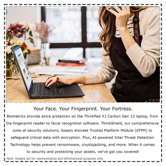 Lenovo ThinkPad X1 Carbon Gen12 Laptop Your Face. Your Fingerprint. Your Fortress. Biometrics provide extra protection on the ThinkPad X1 Carbon Gen 12 laptop, from the fingerprint reader to facial recognition software. ThinkShield, our comprehensive suite of security solutions, boasts discrete Trusted Platform Module (dTPM) to safeguard critical data with encryption. Plus, AI-powered Intel® Threat Detection Technology helps prevent ransomware, cryptojacking, and more. When it...Regular price $1,599.00Regular priceUnit price / perSale price $1,599.00 -