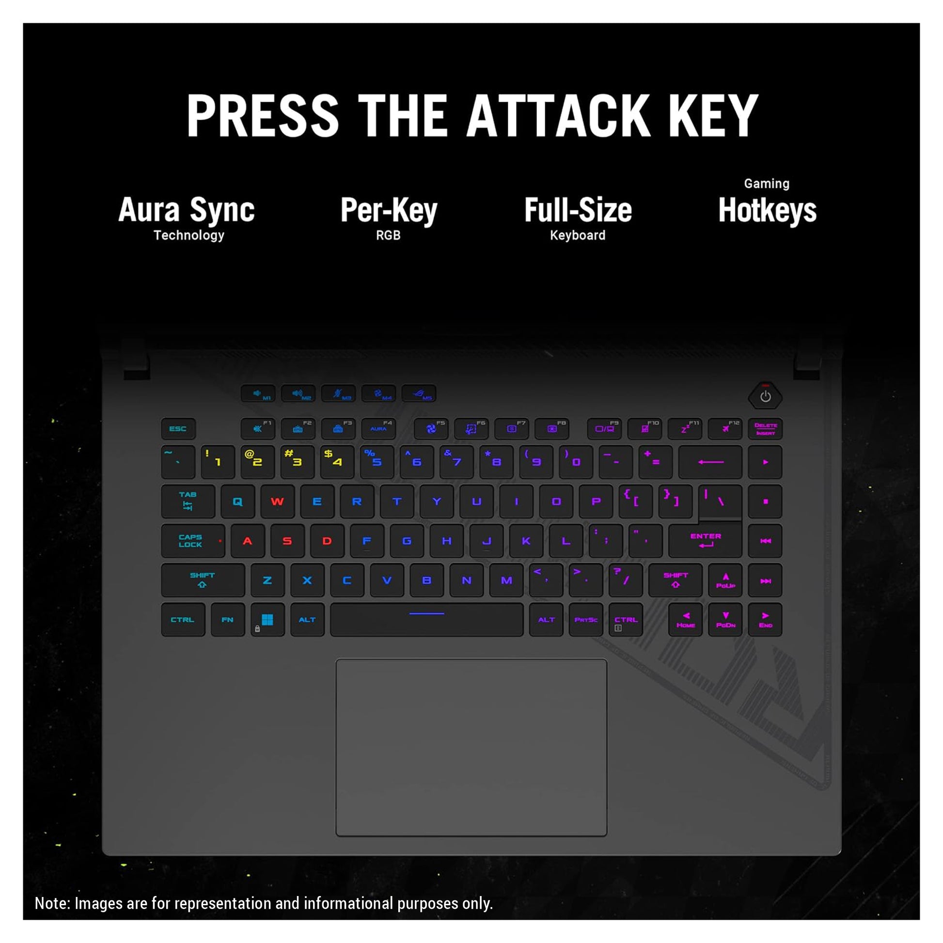 The difference between victory and defeat can be separated by a single keystroke, so the Strix G16 has a full-size keyboard designed to secure the win. Overstroke technology offers sublime work and play, reducing key actuation and improving responsiveness. Built with gamers in mind, the keyboard features spaced function keys for intuitive identification and dedicated hotkeys for quick access to essential commands. Large arrow keys allow for more accurate control in the heat of battle. A larger touchpad means easier tracking across all of your applications, while per-key RGB lighting lets you choose from millions of colors on every key for endless customization. You can also create game specific layouts via Armoury Crate, making every game feel unique.
