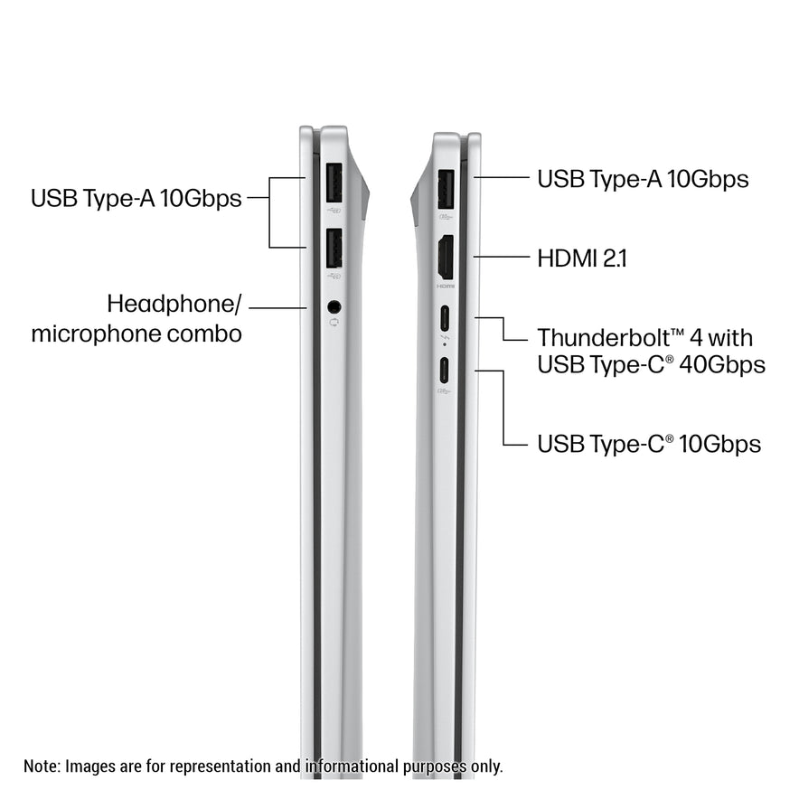 1 Thunderbolt 4 with USB Type-C (40Gbps signaling rate, USB Power Delivery, DisplayPort 2.1, HP Sleep and Charge), 1 USB Type-C (10Gbps signaling rate, USB Power Delivery, DisplayPort 1.4a, HP Sleep and Charge), 3 USB Type-A (10Gbps signaling rate), 1 headphone/microphone combo, 1 HDMI 2.1.