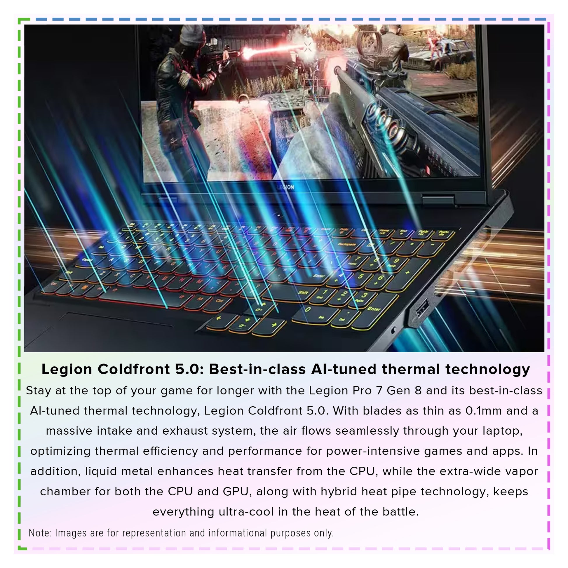 AI powered via Lenovo AI Engine+ unleashes a future-proof and uniquely Legion performance for competitive gamers. The Legion Pro 7i flaunts fully-powered Intel Core 14th generation processors and 40 Series NVIDIA GeForce RTX Graphics for searing processing power. The all-new Legion ColdFront: Vapor means vapor chamber cooling, expanded intelligent intake, and an upgraded fan and exhaust system with customized fan curve control to keep things cool while you game competitively, on a massive up to 99.99Whr battery.