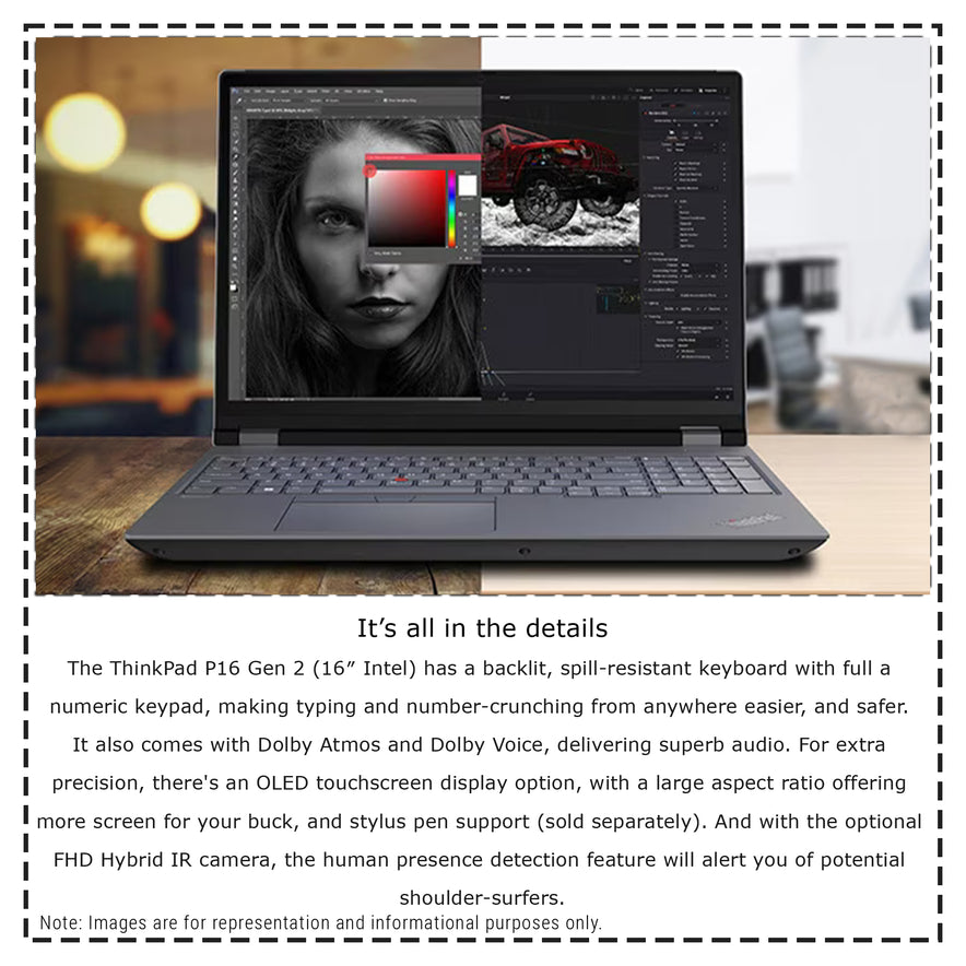 The ThinkPad P16 Gen 2 (16″ Intel) has a backlit, spill-resistant keyboard with full a numeric keypad, making typing and number-crunching from anywhere easier, and safer. It also comes with Dolby Atmos and Dolby Voice, delivering superb audio. For extra precision, there's an OLED touchscreen display option, with a large aspect ratio offering more screen for your buck, and stylus pen support (sold separately). And with the optional FHD Hybrid IR camera, the human presence detection feature will alert you of potential shoulder-surfers.