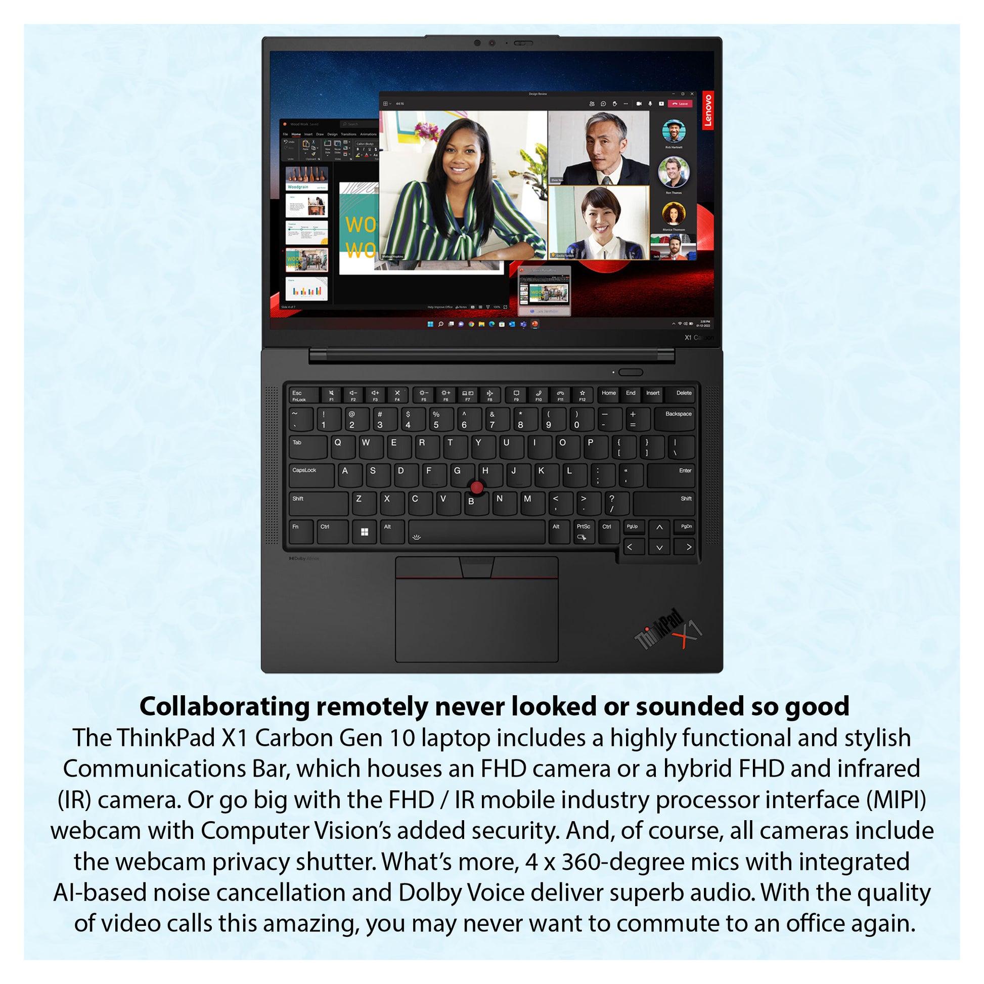 The ThinkPad X1 Carbon Gen 11 laptop includes a highly functional and stylish Communications Bar, which houses an FHD camera or a hybrid FHD and infrared (IR) camera. Or go big with the FHD / IR mobile industry processor interface (MIPI) webcam with Computer Vision’s added security. And, of course, all cameras include the webcam privacy shutter. What’s more, 4 x 360-degree mics with integrated AI-based noise cancellation and Dolby Voice deliver superb audio. With the quality of video calls this amazing, you may never want to commute to an office again.