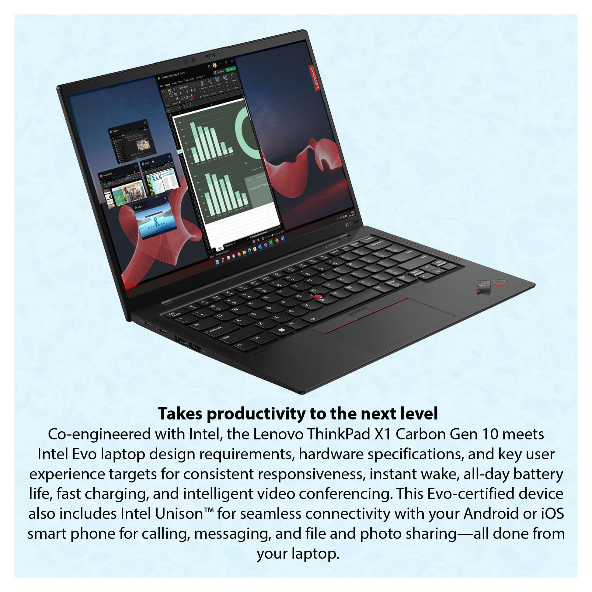 Co-engineered with Intel, the Lenovo ThinkPad X1 Carbon Gen 11 meets Intel Evo laptop design requirements, hardware specifications, and key user experience targets for consistent responsiveness, instant wake, all-day battery life, fast charging, and intelligent video conferencing. This Evo-certified device also includes Intel Unison for seamless connectivity with your Android or iOS smart phone for calling, messaging, and file and photo sharing—all done from your laptop.