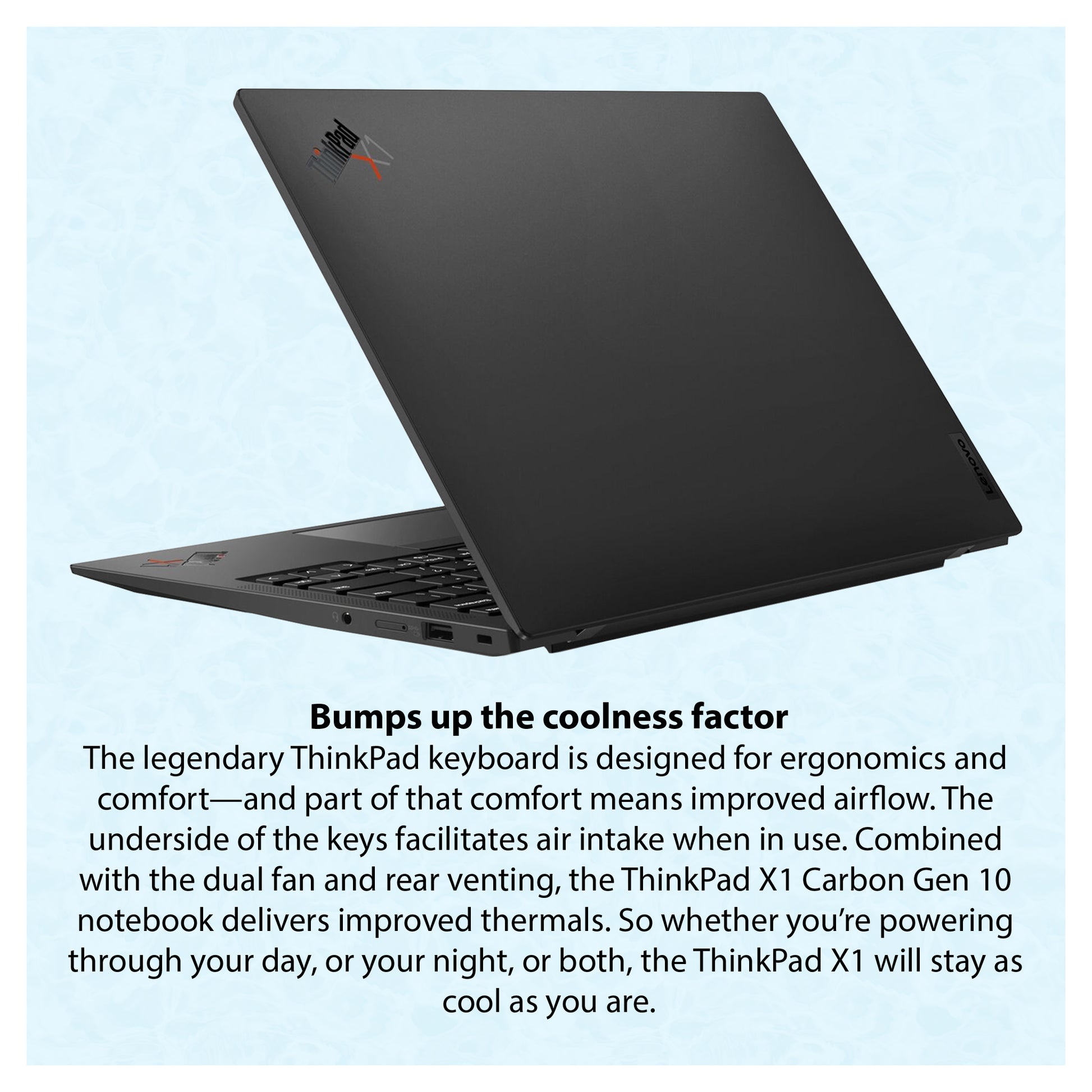 The legendary ThinkPad keyboard is designed for ergonomics and comfort—and part of that comfort means improved airflow. The underside of the keys facilitates air intake when in use. Combined with the dual fan and rear venting, the ThinkPad X1 Carbon Gen 11 notebook delivers improved thermals. So whether you’re powering through your day, or your night, or both, the ThinkPad X1 will stay as cool as you are.