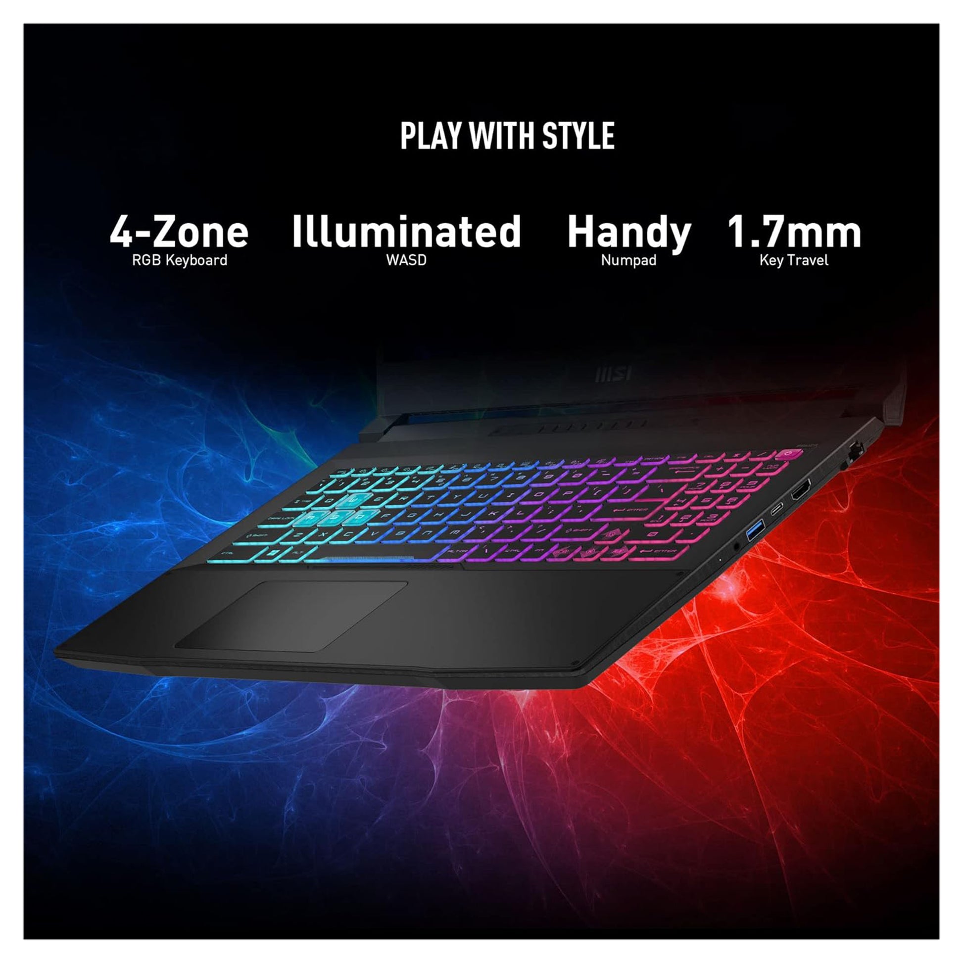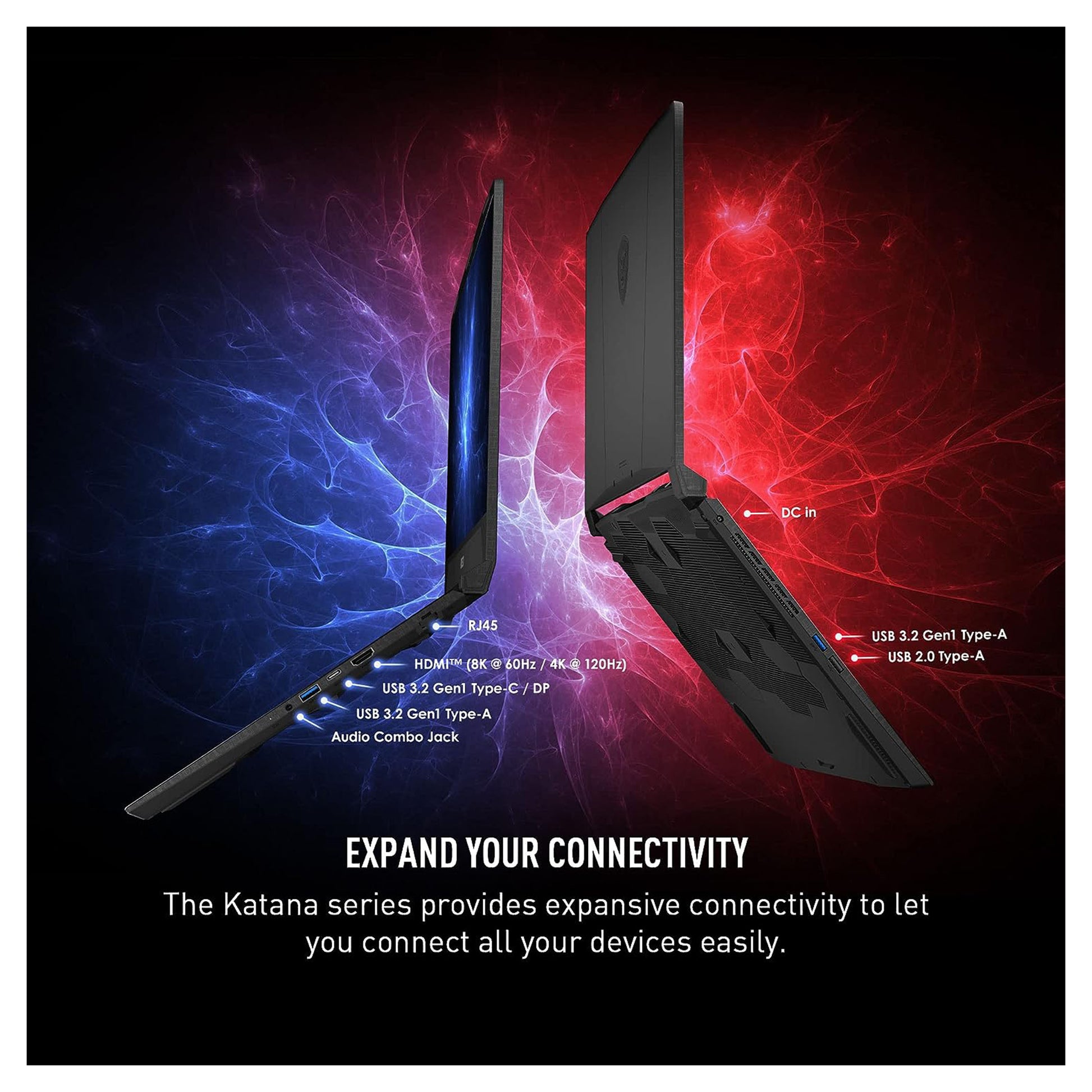The Katana 15 features a plethora of ports, including a HDMI 2.1 port that can output up to 8K 60 Hz or 4K 120 Hz. The RJ45 LAN jack allows for a wired Gigabit Ethernet connection. USB-C and USB-A ports are available, as well as a 3.5mm audio combo jack.