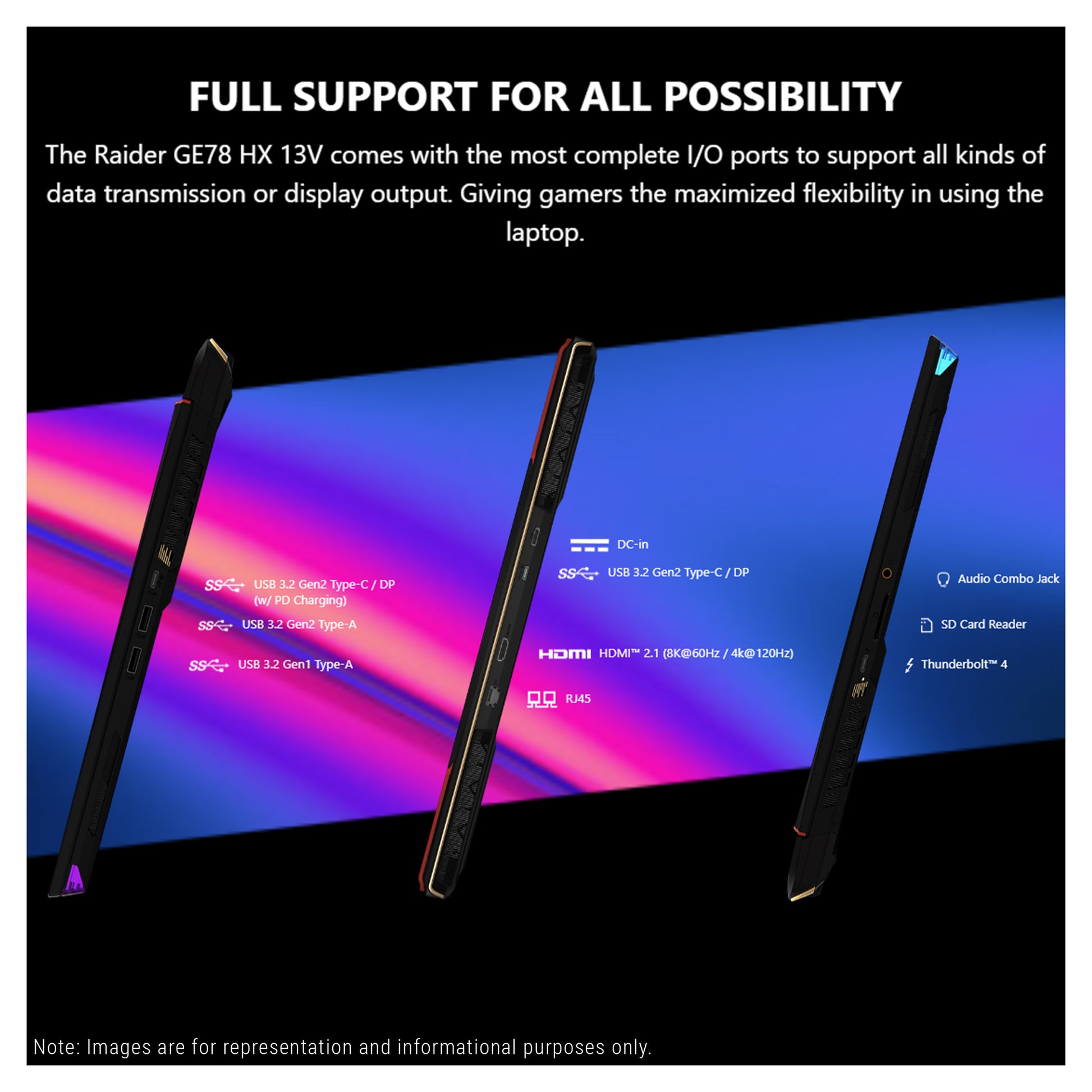 The Raider GE78 HX 13V comes with the most complete I/O ports to support all kinds of data transmission or display output. Giving gamers the maximized flexibility in using the laptop.