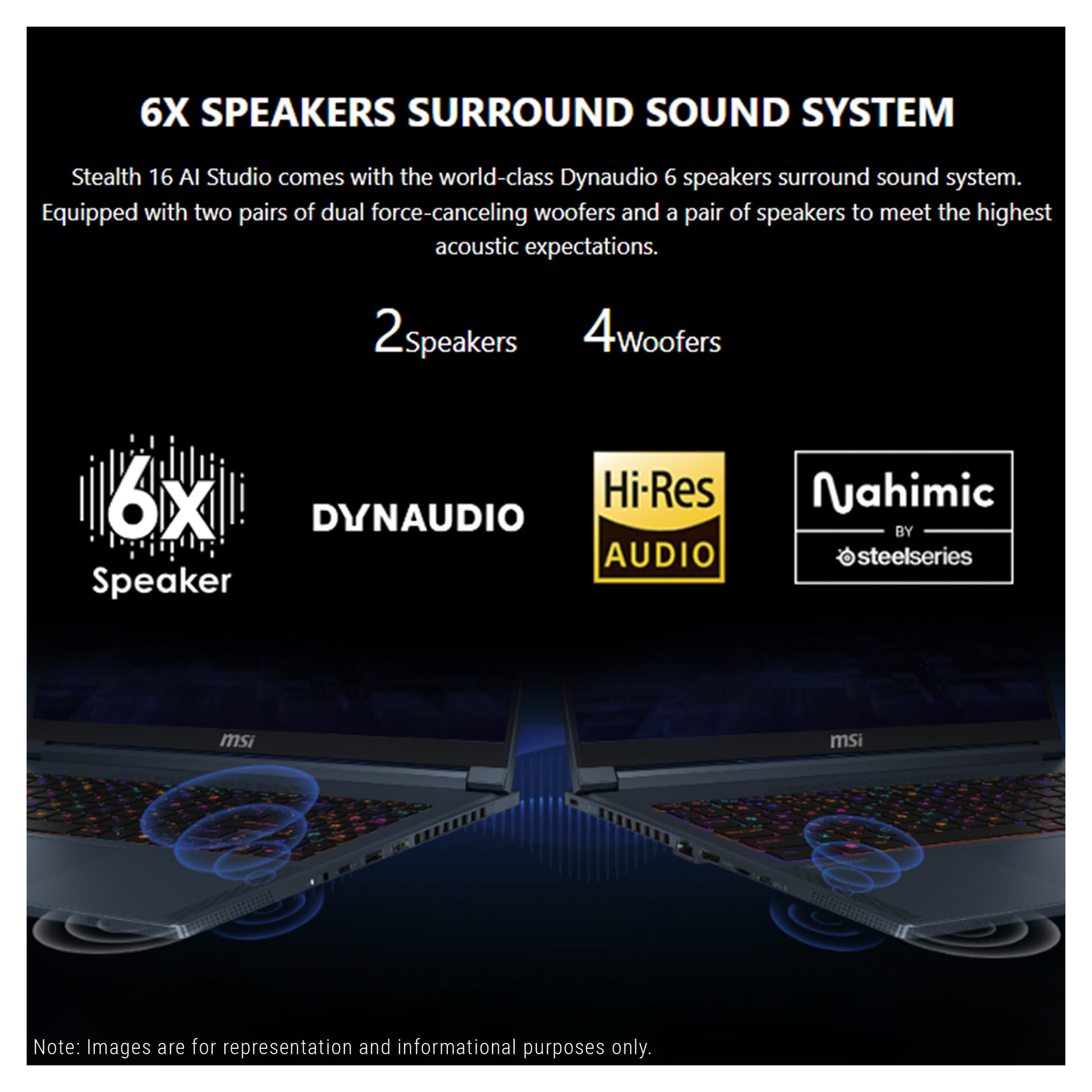 The MSI Stealth 16 AI Studio perfectly balances cutting-edge performance and refined aesthetics, making it an ideal choice for both creative professionals and gaming enthusiasts. Its slim, aluminum-alloy chassis in striking Star Blue not only exudes elegance but also ensures exceptional durability for life on the move.