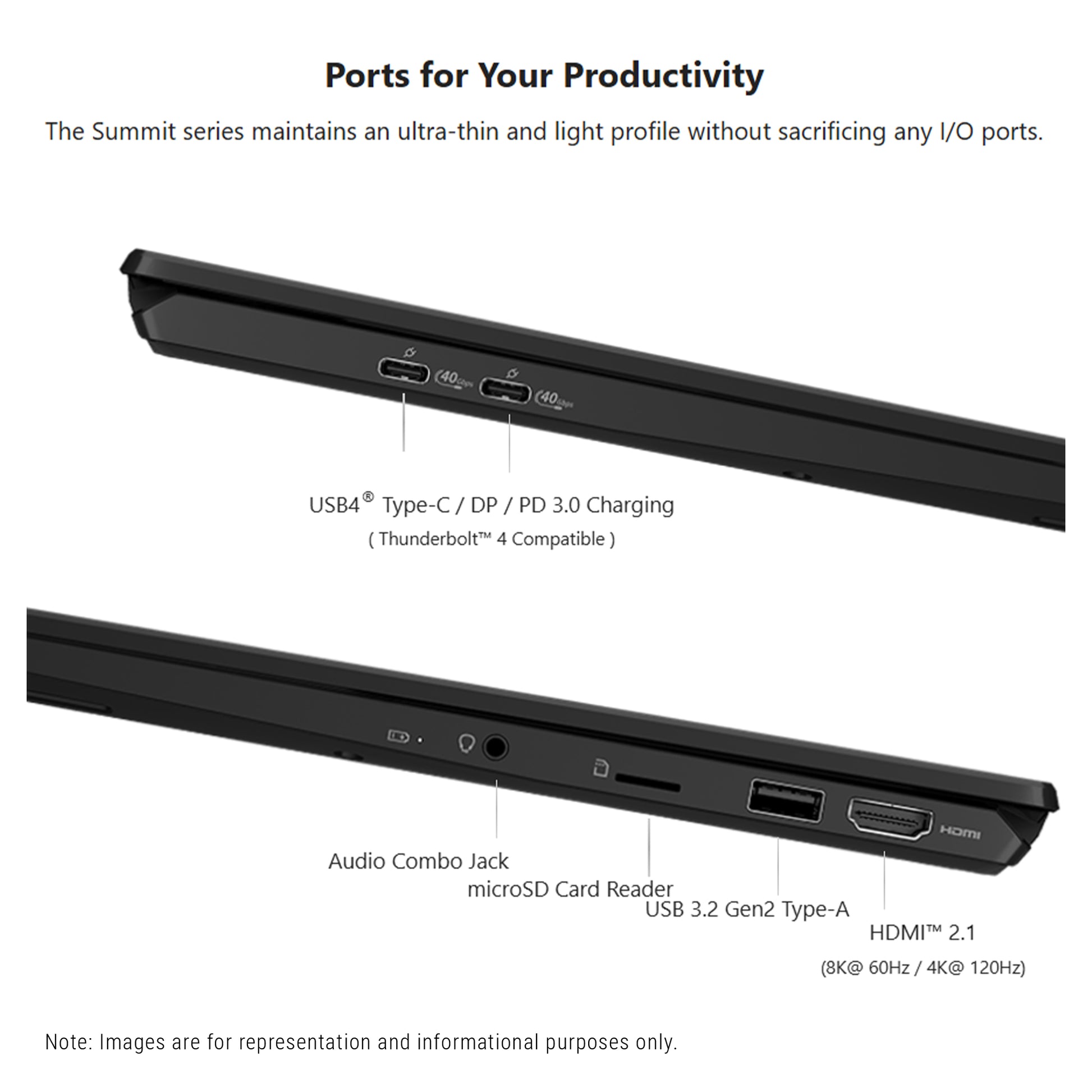 Stay productive on the move thanks to a long-lasting 82Wh battery and rapid USB4® Type-C charging. The Summit A16 AI+ offers comprehensive I/O options, including HDMI 2.1, Thunderbolt/USB4 ports, microSD card slot, and Wi-Fi 7, supporting effortless connections to all your devices and peripherals.
